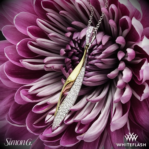 The Simon G. DP198 two-tone 18k diamond pendant features a graceful and fluid design encrusted with diamonds. Elongated and fluid, this brilliant design flows as if in motion.