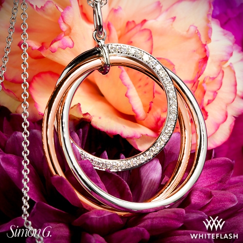Intertwined circles create the stage for this eye-catching modern white and rose gold pendant set with .14 ctw of shimmering round cut white diamonds. If you have any questions regarding this item then please contact one of our friendly diamond and jewelry consultants at 1-877-612-6770.